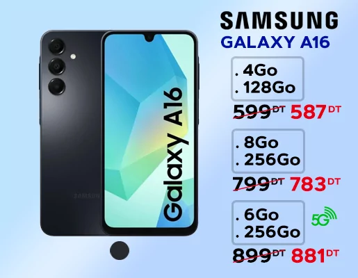 Samsung A16 - Ecran : 6.7" Super Amoled FHD+ (2340x 1080px), 90Hz- Processeur : Octa-Core Mediatek Hélio G99 (6 nm) - Système d’exploitation : Android 14, jusqu'à 6 mises à niveau Android majeures, One UI 6.1 - Mémoire : 6 Go - Stockage : 128Go - Appareil photo arrière : Trio 50MP + 5MP + 2MP- Avant : 13Mp - Capacité de Batterie : 5000 mAh - charge rapide 25W - Connectivité: 4G, Wifi et Bluetooth 5.3, NFC - Double sim - Lecteur d'empreinte digitale - Résistant à la poussière et à l'eau IP54 - Couleur : Vert - Garantie : 1 an